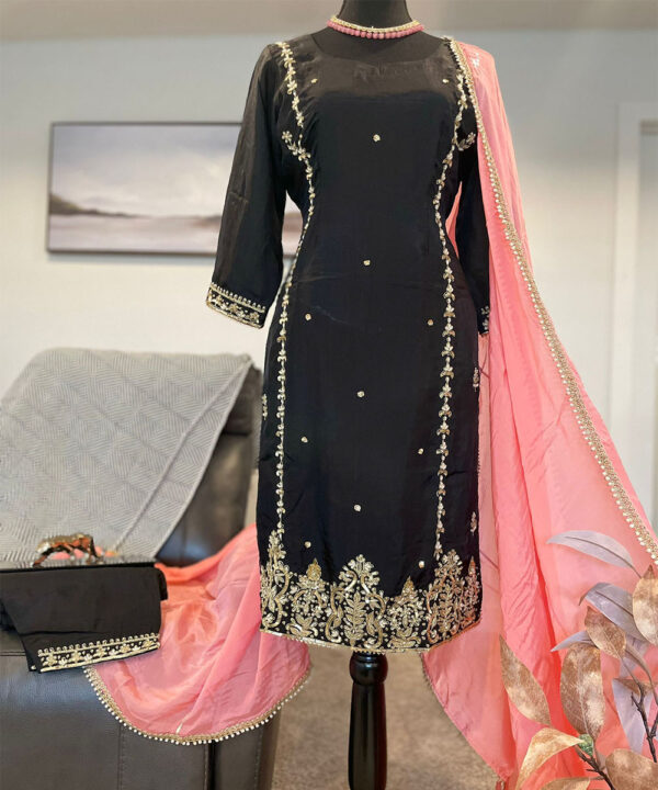 This exquisite Punjabi suit is a true masterpiece of traditional elegance and modern refinement. The outfit features a classic black kameez beautifully adorned with intricate golden embroidery that enhances its regal appeal. The fine detailing along the neckline, sleeves, and borders highlights expert craftsmanship, while small golden motifs scattered throughout the fabric add a subtle yet captivating sparkle. The hemline showcases rich embroidery that gives the attire a luxurious touch. Complementing the black kameez is a soft peach dupatta, elegantly finished with delicate pearl edging that adds a graceful contrast to the dark base.