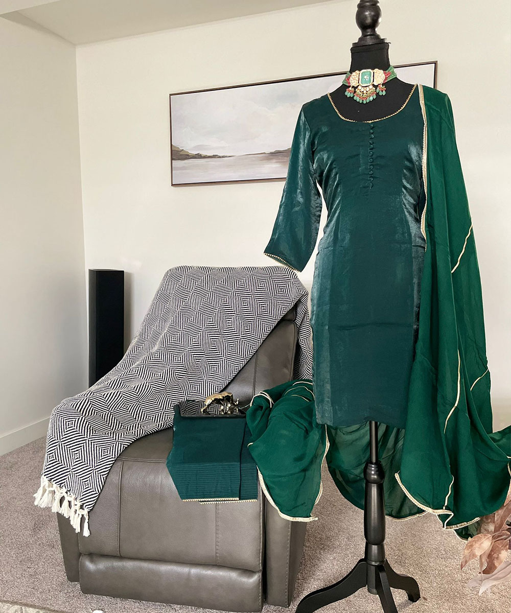 When styled with traditional jewelry, such as the statement choker shown, this suit radiates understated luxury. The deep green hue symbolizes growth, balance, and elegance—perfect for celebrations, family gatherings, or evening events. Designed for women who appreciate minimalistic beauty and traditional refinement, this bottle green Punjabi suit stands out as a graceful and versatile piece that blends simplicity with sophistication.