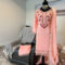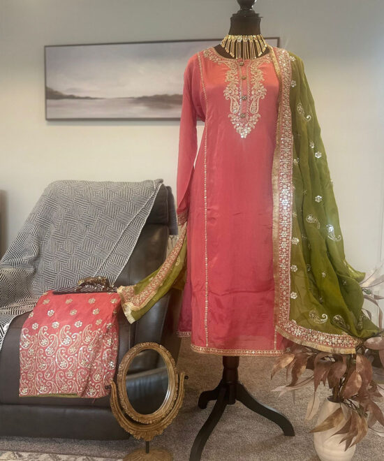 The embroidery, highlighted with delicate threadwork and fine detailing, adds a regal touch to the ensemble. The subtle golden border running along the dupatta and kameez further accentuates the outfit’s grace. Paired with a matching peach bottom and dupatta, this suit reflects a perfect balance of simplicity and sophistication. The lightweight fabric ensures comfort, while the meticulous craftsmanship gives it a luxurious finish.