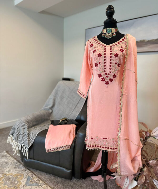 This exquisite Punjabi suit captures the essence of soft elegance and traditional artistry. Crafted in a soothing peach tone, the kameez is beautifully embellished with intricate maroon floral embroidery across the neckline and borders, creating a charming contrast that enhances its appeal.
