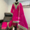 Paired with the kurta is a matching dupatta in the same striking fuchsia shade, featuring subtle golden motifs scattered across the fabric. The dupatta is finished with an ornate embroidered border in green and gold, perfectly complementing the kurta’s detailing. The coordinated salwar completes the ensemble, maintaining a balanced and polished appearance.