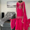 The sharara-style bottom adds volume and flair, completing the ensemble with a regal touch. The mannequin is accessorized with a bold and ornate choker necklace that enhances the outfit’s festive appeal. Placed beside the mannequin is a comfortable grey armchair draped with a patterned throw, contributing to the cozy and well-styled setup. The soft-colored wall art in the background adds a sophisticated and minimalistic backdrop, ensuring the bright pink outfit remains the focal point.