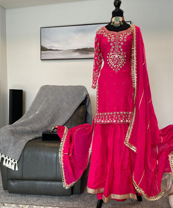 This photo beautifully showcases a vibrant pink Punjabi sharara suit displayed on a sleek black mannequin, exuding elegance, richness, and festive charm. The kameez is adorned with intricate embroidery featuring delicate golden threadwork, floral patterns, and a stunning heart-shaped design at the center that adds a touch of royal artistry. The neckline and sleeves are embellished with detailed motifs, enhancing the traditional aesthetic of the outfit. Draped gracefully over one shoulder, the matching pink dupatta features a shimmering gold border with tassel-like detailing, perfectly complementing the embroidery on the kameez.