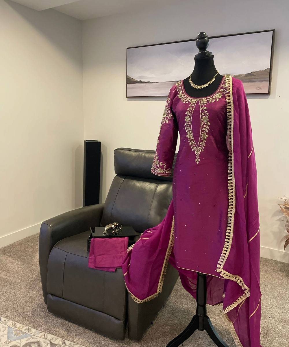 This stunning magenta purple salwar kameez suit is designed for those who appreciate elegance with a rich, festive touch. The kameez is beautifully enhanced with detailed golden embroidery around the neckline, front panel, and sleeves, creating a graceful focal point that elevates the overall look. Subtle embellishments scattered across the fabric add a soft shimmer, making the outfit refined yet eye-catching.