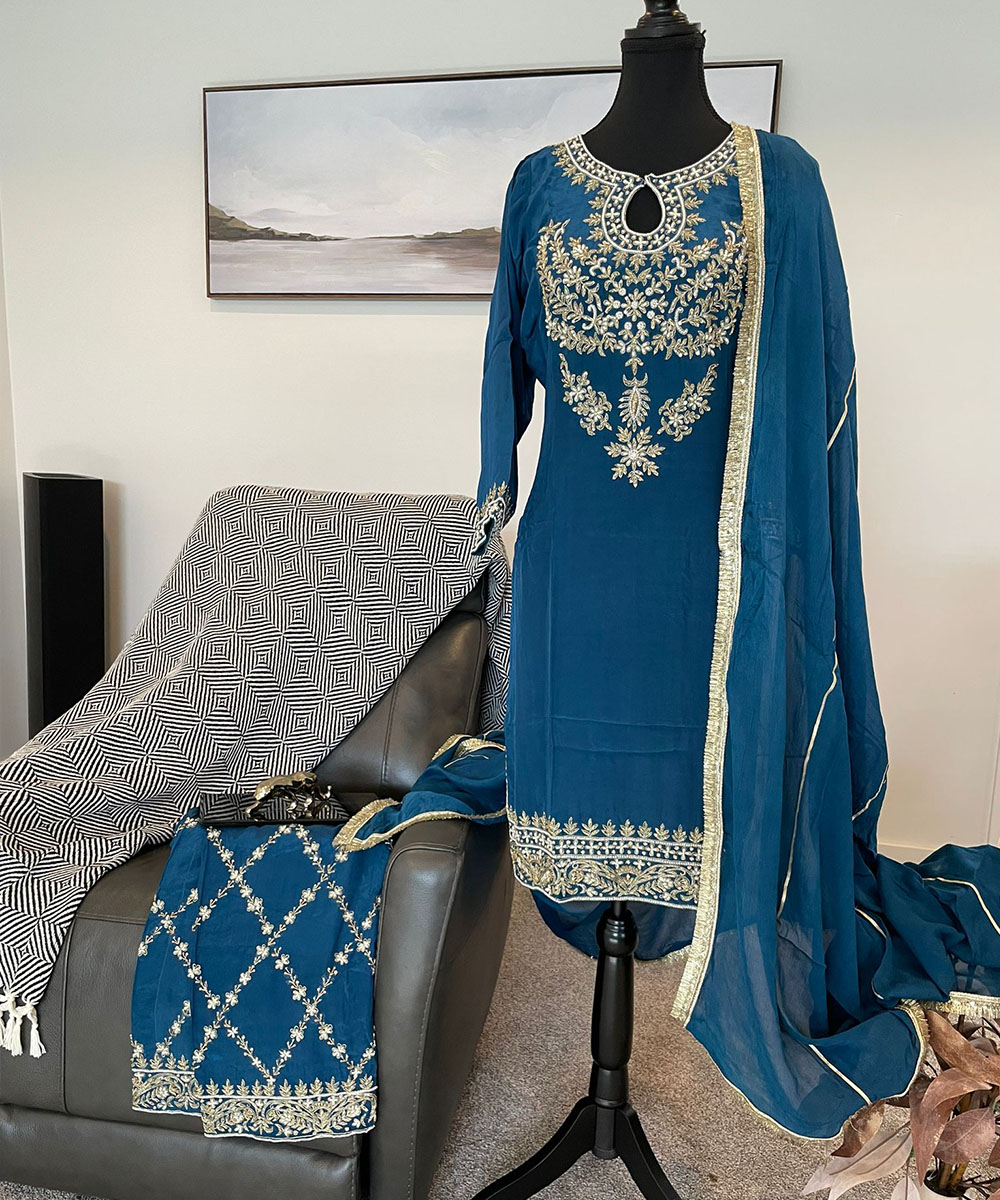 This stunning royal blue Punjabi suit is a true embodiment of elegance and grace. Crafted from premium fabric, it features exquisite golden thread embroidery that enhances its rich appeal. The intricately embroidered neckline, adorned with a teardrop cutout, adds a sophisticated and feminine touch to the design.