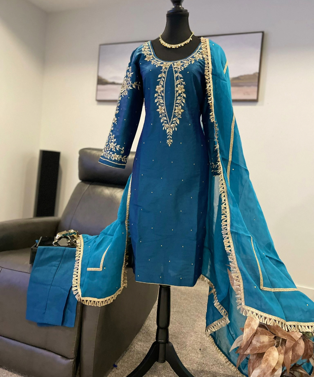 A graceful teal blue salwar kameez featuring elegant golden embroidery and delicate detailing. Comes with a matching dupatta and coordinating bottoms for a complete traditional look. Perfect for festive events, family