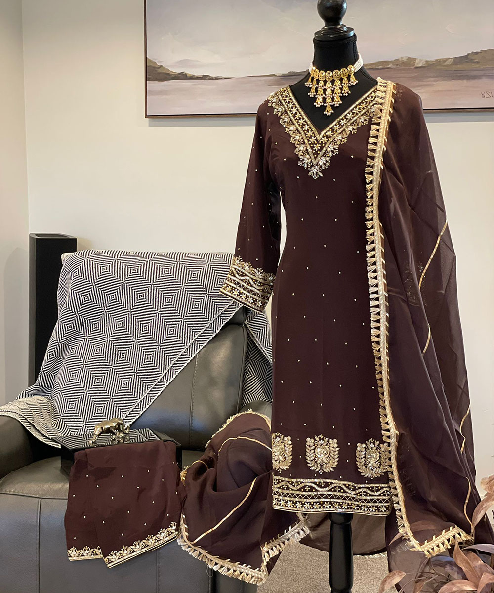 This chocolate brown embroidered suit features elegant golden detailing on the neckline, sleeves, and hem. Paired with a matching dupatta and statement jewelry, it offers a regal and refined look. Perfect for festive occasions and weddings, the outfit blends traditional craftsmanship with timeless sophistication